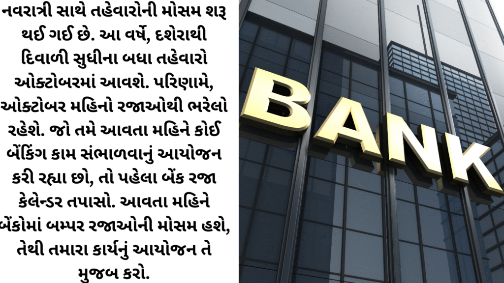 નવરાત્રી સાથે તહેવારોની મોસમ શરૂ થઈ ગઈ છે. આ વર્ષે, દશેરાથી દિવાળી સુધીના બધા તહેવારો ઓક્ટોબરમાં આવશે. પરિણામે, ઓક્ટોબર મહિનો રજાઓથી ભરેલો રહેશે. જો તમે આવતા મહિને કોઈ બેંકિંગ કામ સંભાળવાનું આયોજન કરી રહ્યા છો, તો પહેલા બેંક રજા કેલેન્ડર તપાસો. આવતા મહિને બેંકોમાં બમ્પર રજાઓની મોસમ હશે, તેથી તમારા કાર્યનું આયોજન તે મુજબ કરો.