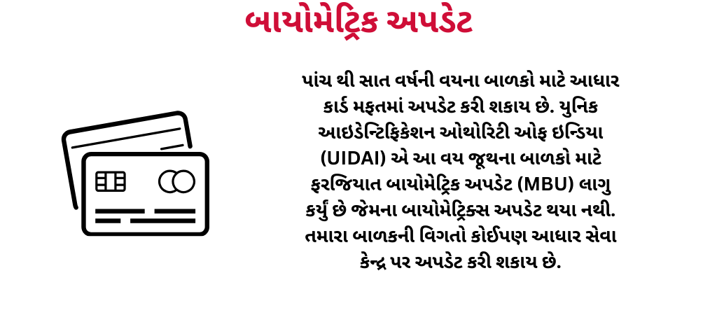 તેથી, બાળક પાંચ વર્ષનું થયા પછી ફિંગરપ્રિન્ટ્સ, આઇરિસ અને ફોટોગ્રાફને આધારમાં ફરજિયાતપણે અપડેટ કરવા આવશ્યક છે. પાંચથી સાત વર્ષની ઉંમર વચ્ચેના પ્રથમ ફરજિયાત બાયોમેટ્રિક અપડેટ માટે કોઈ ફી નથી. સાત વર્ષની ઉંમર પછી, 100 રૂપિયા ફી ચૂકવવાની રહેશે.