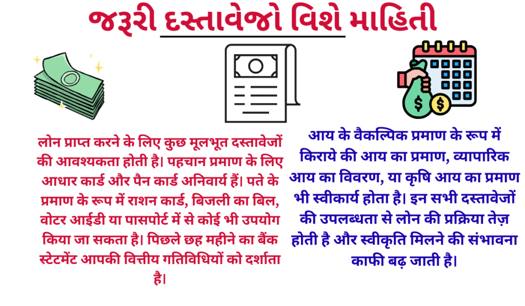 લોન મેળવવા માટે કેટલાક મૂળભૂત દસ્તાવેજો જરૂરી છે. ઓળખના પુરાવા માટે આધાર કાર્ડ અને પાન કાર્ડ ફરજિયાત છે. સરનામાના પુરાવા તરીકે રેશન કાર્ડ, વીજળી બિલ, મતદાર ID અથવા પાસપોર્ટનો ઉપયોગ કરી શકાય છે. છેલ્લા છ મહિનાના બેંક સ્ટેટમેન્ટ તમારી નાણાકીય પ્રવૃત્તિઓને પ્રતિબિંબિત કરે છે.