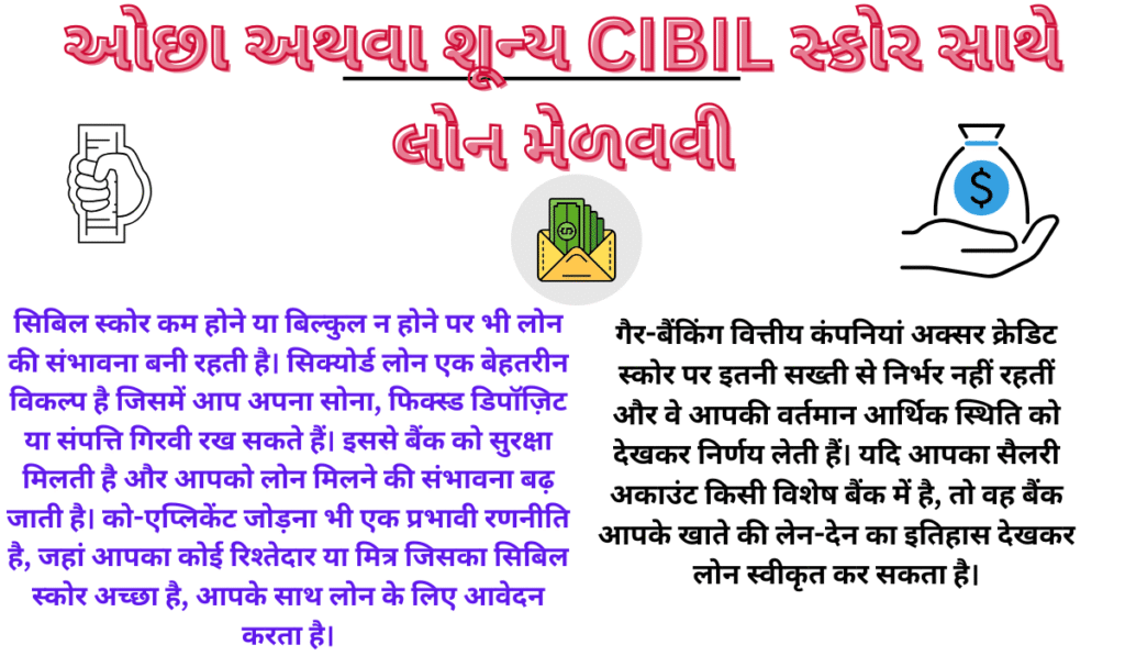 ઓછા અથવા અસ્તિત્વમાં ન હોય તેવા CIBIL સ્કોર સાથે પણ, લોન મેળવવાની શક્યતા રહે છે. સુરક્ષિત લોન એ એક શ્રેષ્ઠ વિકલ્પ છે જ્યાં તમે તમારું સોનું, ફિક્સ્ડ ડિપોઝિટ અથવા મિલકત ગીરવે મૂકી શકો છો. આ બેંકને સુરક્ષા પૂરી પાડે છે અને લોન મેળવવાની શક્યતાઓ વધારે છે. સહ-અરજદાર ઉમેરવા એ પણ એક અસરકારક વ્યૂહરચના છે, જ્યાં સારા CIBIL સ્કોર ધરાવતો સંબંધી અથવા મિત્ર તમારી સાથે લોન માટે અરજી કરે છે.