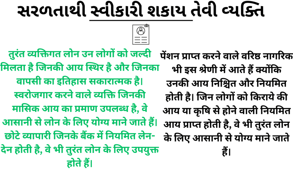 પેન્શન મેળવતા વરિષ્ઠ નાગરિકો પણ આ શ્રેણીમાં આવે છે કારણ કે તેમની આવક નિશ્ચિત અને નિયમિત હોય છે. ભાડાની આવક અથવા ખેતીમાંથી નિયમિત આવક મેળવતા લોકો પણ તાત્કાલિક લોન માટે સરળતાથી પાત્ર બને છે.